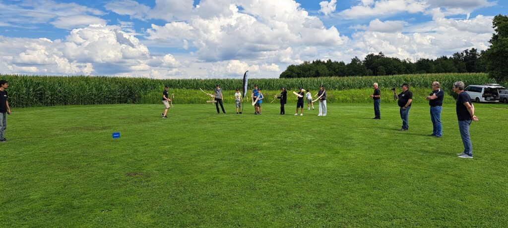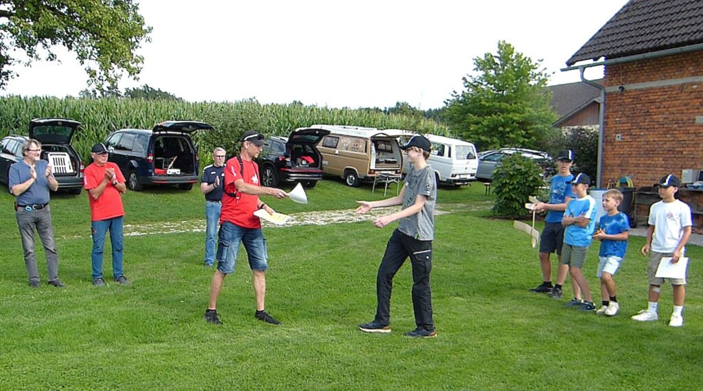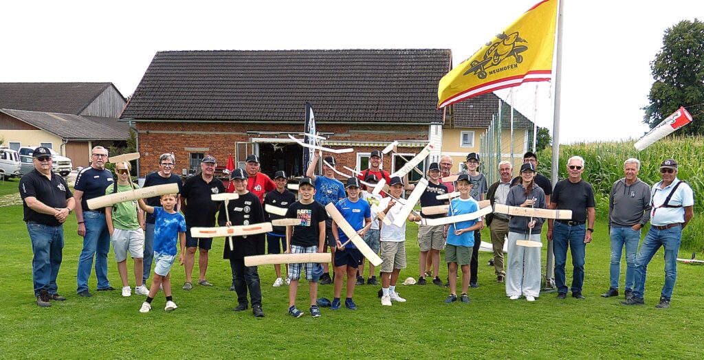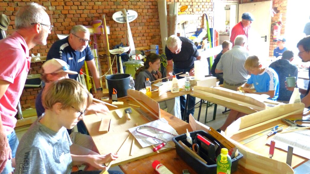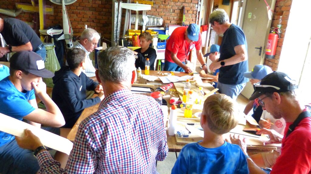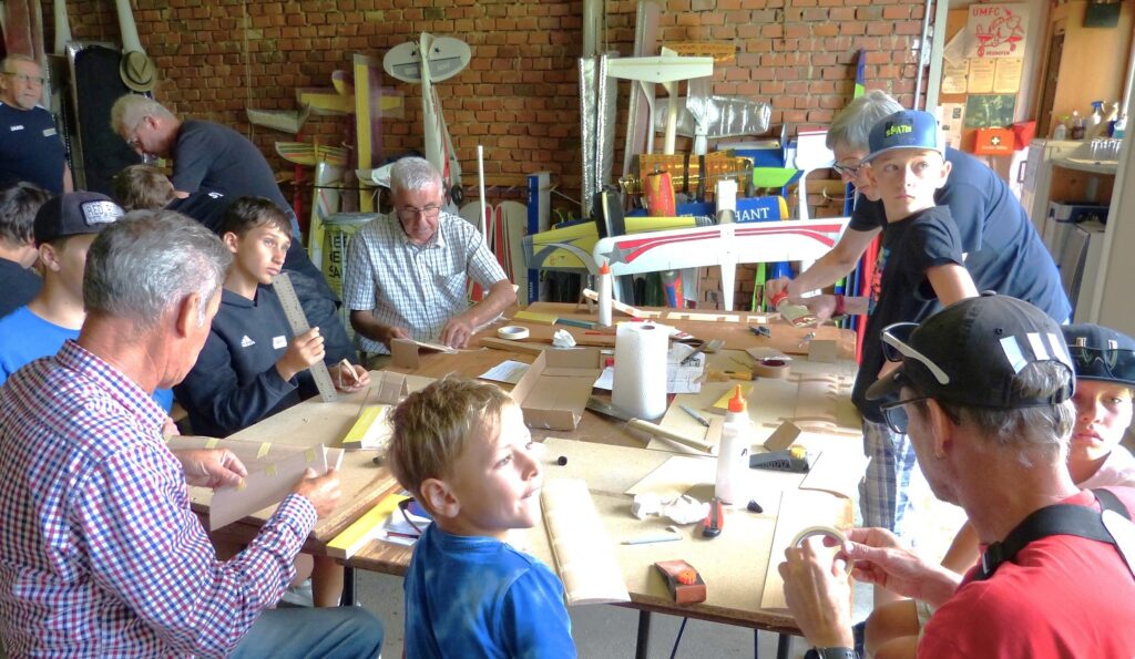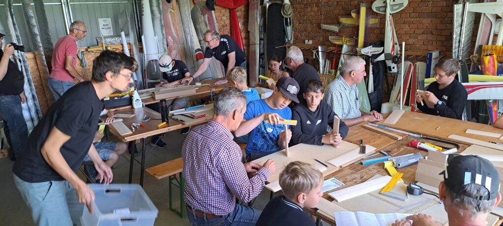 Zwölf Jugendliche – darunter ein junges Mädchen – haben einen Tag bei uns verbracht. Gleich nach der Anmeldung ging es pünklich um 10 Uhr vormittags los. Mit großem Eifer wurde ein Modell aus Balsa- und Kieferholz gebaut – es wurde gesägt, geschliffen, geklebt, zusammen gebaut – ausgerichtet und beschriftet. Jeder hatte sein eigenes Modell! In den kurzen Pausen konnten die Jugendlichen auf Flugsimulatoren für den Nachmittag üben. Ein gutes Mittagessen und viel Kuchen für den weitern Tag, dazu feinstes Wetter ……….Herz – was willst du mehr!